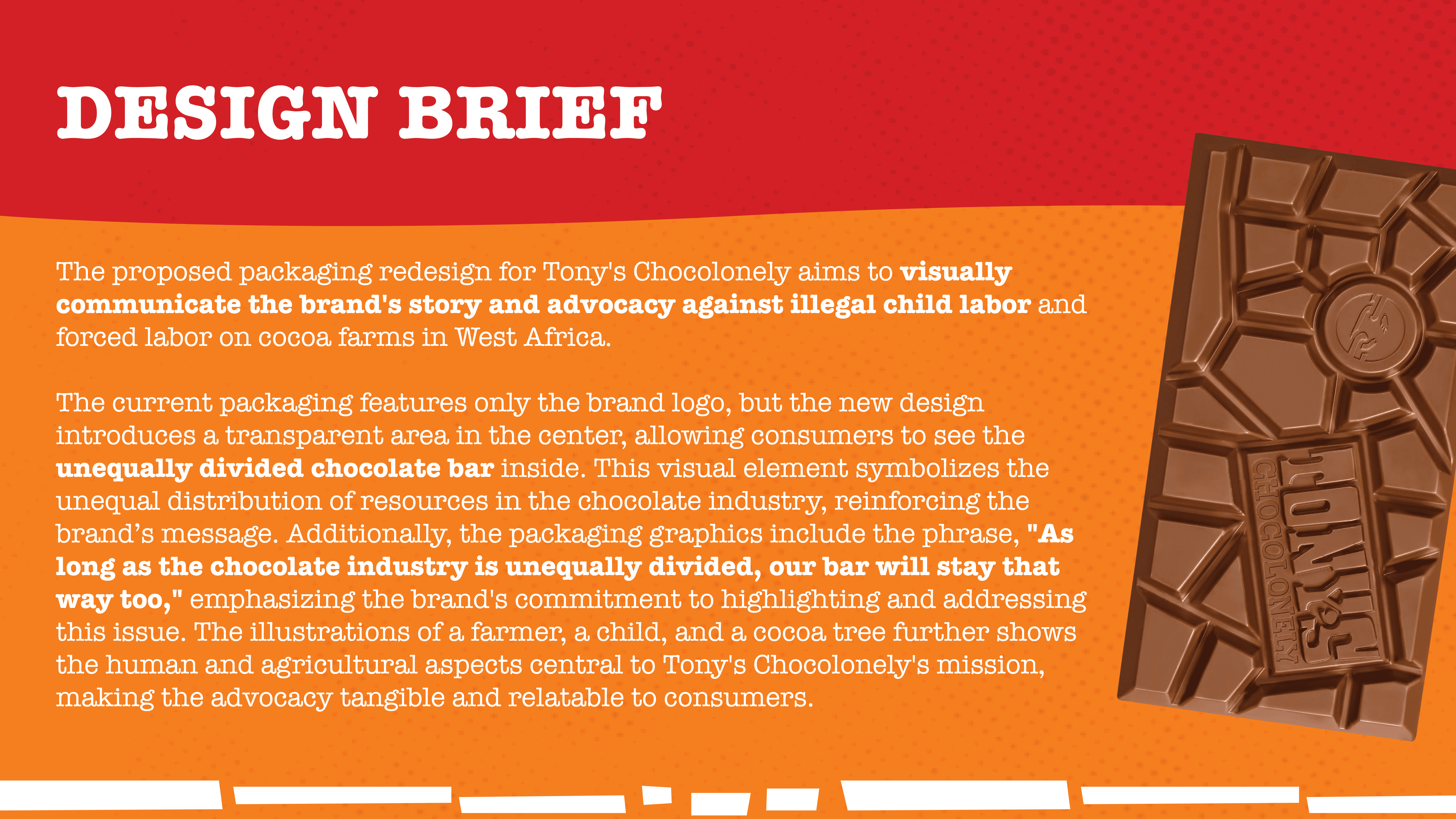 Tony's Chocolonely’s current packaging does not fully communicate the brand's commitment to fighting inequality and exploitation in the cocoa industry, making it harder for consumers to understand the brand's mission at a glance.
